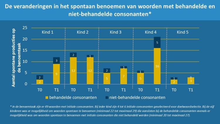 Gemiddeld benoemen de kinderen spontaan 4,2 woorden meer met behandelde consonanten en 0,4 woorden meer met niet-behandelde consonanten